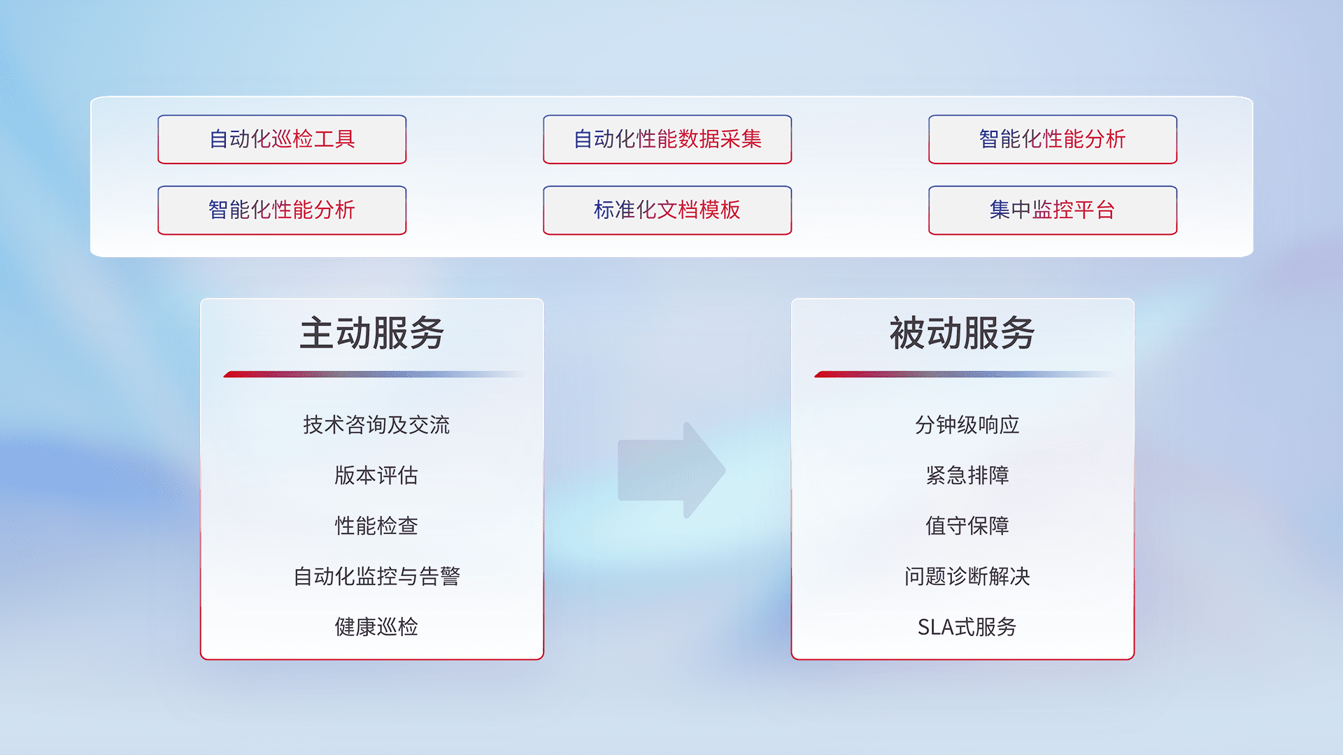 智能化工具和标准化文档,,,,保障服务质量,,提供主动服务(包含技术咨询、、版本评估、、性能检查、、、自动化监控与告警、、、健康巡检)和被动服务包含(分钟级响应、、、紧急排障、、、值守保障、、、、问题诊断解决、、、SLA服务)。。